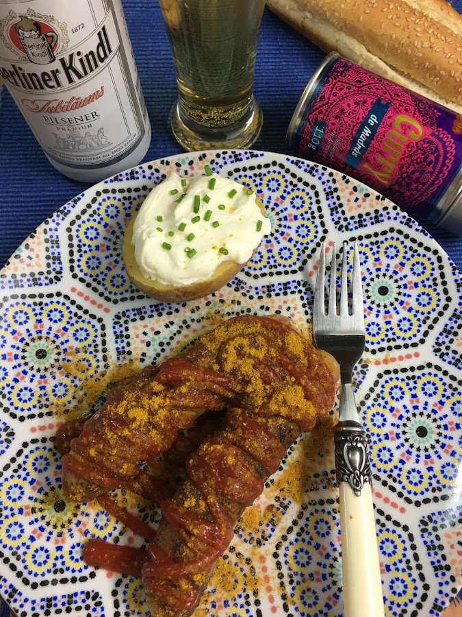 Se sirven con el ketchup por encima y se espolvorean generosamente con curry.