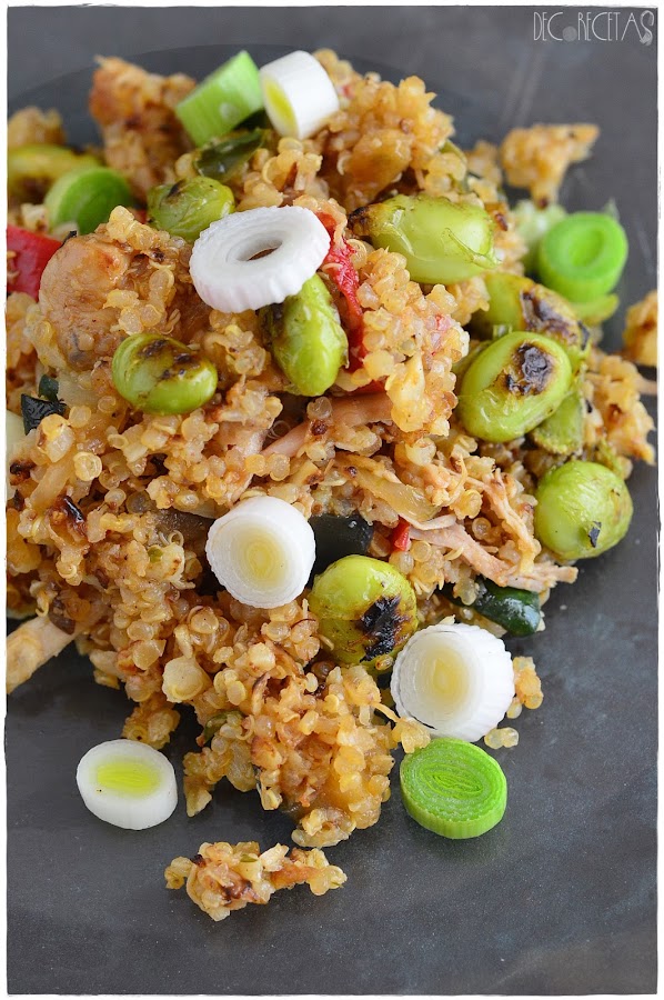 En un wok, pasamos con una gota de aceite el cus-cús de coliflor, hasta que adquiera cierto tono dorado sin parar de removerlo. En ese punto, agregamos la quinoa cocida y reservamos a parte. En el mismo wok, sofreímos media cebolla, junto con un trozo de calabacín y berenjena, y medio pimiento rojo todo en cubitos. Por último, agregamos la coliflor y la que no reservadas de antes y culminamos con unas habitas de edamame previamente cocidas y pasadas por la plancha y cebolleta fresca