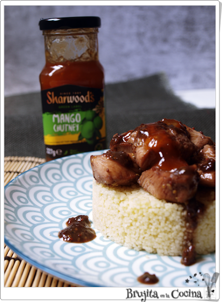 Servimos poniendo el cuscus en la base, después unos dados del pollo y su salsa y rociamos con chutney de mango.