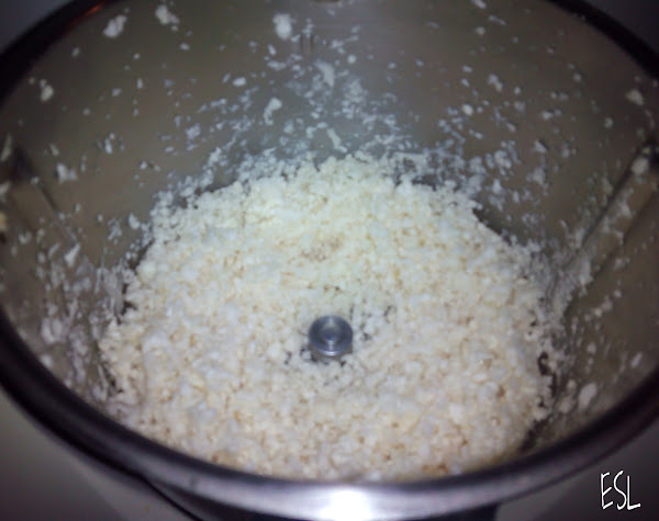 Corta la coliflor en ramilletes y a continuación lava bajo el grifo y seca con papel absorbente. Coloca los trozos en una picadora o en el vaso de la thermomix y pícala hasta que queden granitos parecidos a los del cuscús (en la thermomix unos 8 segundos en velocidad 6). Reserva.