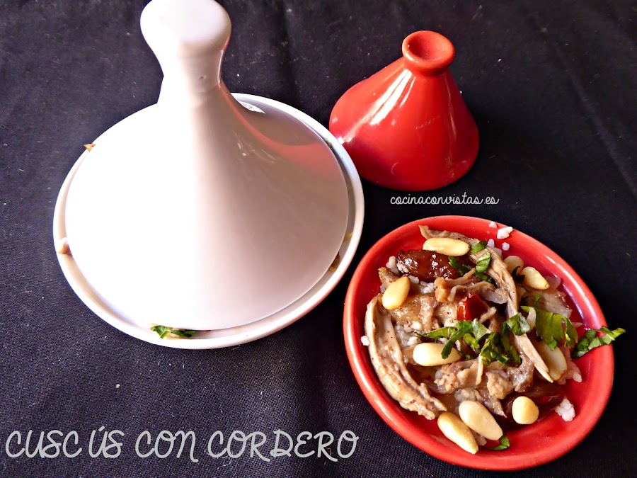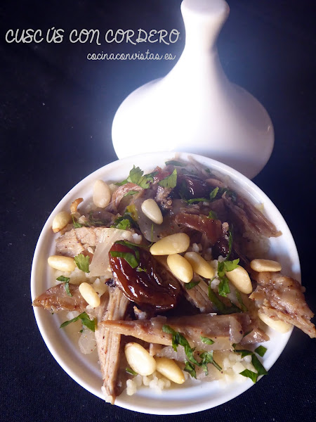 En un bol ponemos el cuscús y le añadimos el caldo de verduras (o agua con sal) muy caliente. Tapamos con un paño y dejamos que el cuscús absorba todo el caldo. Mientras preparamos el cordero.