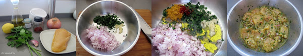 Picar muy fino el ajo, la cebolla y el cilantro. Colocar en un bol. Exprimir el limón.