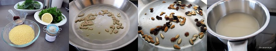 En una sartén o cazuela al fuego, calentar un par de cucharadas de aceite de oliva y dorar los piñones. Añadir las pasas y rehogarlas hasta que se hinchen un poquito.