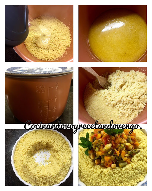 En estos tres minutos que la olla está cocinando las verduras, con las almendras y los garbanzos, continuamos con el cuscús que teníamos reservado e hidratando.