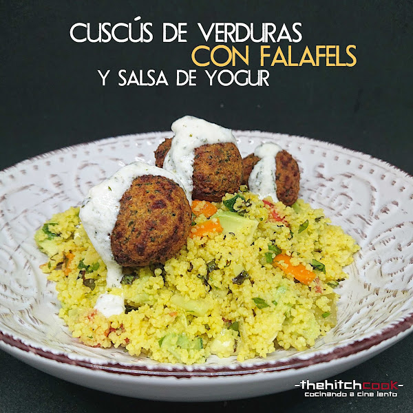 Coge un bonito plato hondo. Agrega el cous-cous aromatizado con hierbas y Ras-Al-Hanout. Coloca encima 2-3 falafels bien dorados y riega con una generosa capa de salsa de yogur.