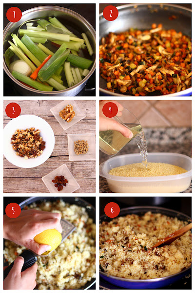 5. Mezclamos ahora el cuscús con la verdura y los frutos secos. Rallamos sobre el cuscús con la verdura la piel de un limón y una naranja. Movemos bien.