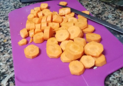 Poner a calentar el agua y cuando hierva, añadir los garbanzos, sal, los dientes de ajo, la zanahoria a rodajas,