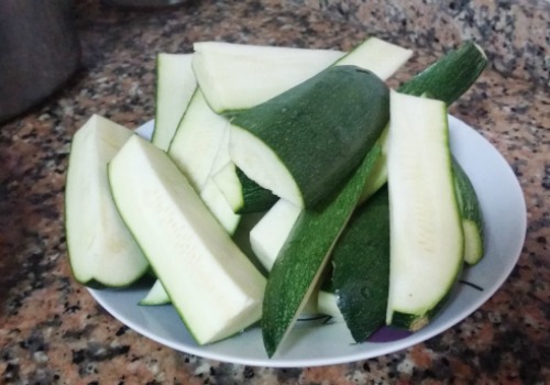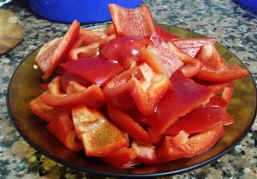 Lo agregamos a la sartén junto con un poco de agua. Sazonamos, tapamos y dejamos cocer durante 5 minutos o hasta que el calabacín esté ligeramente tierno y al dente. Retiramos y reservamos. Cortar el pimiento a trozos