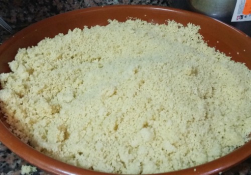 Poner la sémola en una fuente de barro echar por encima el caldo muy caliente. Se deja reposar para que la sémola absorba el caldo.