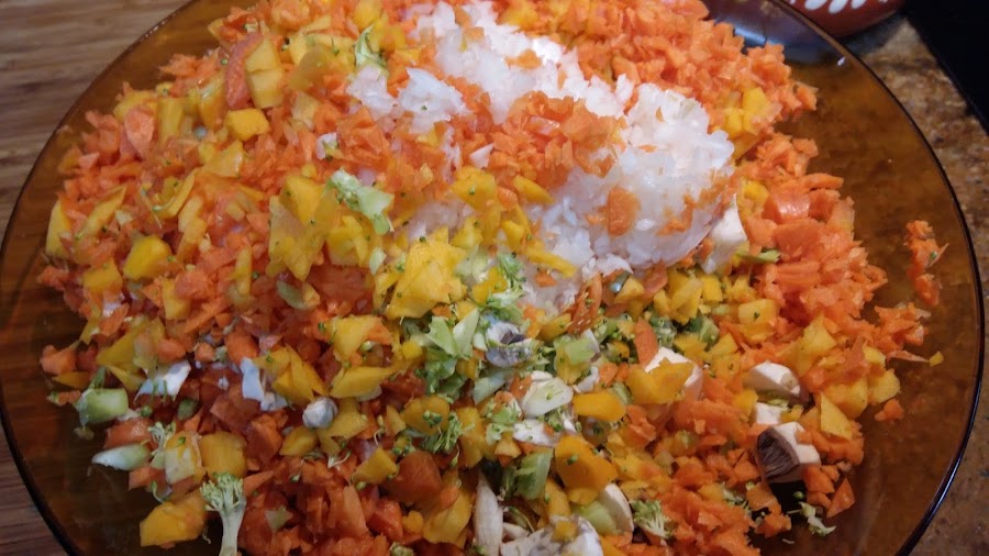 Cortamos todos los vegetales a un tamaño similar para que se cocinen uniformemente. Yo le ha dado un para de toques de picadora, por ir más rápido.