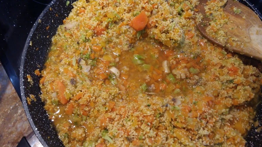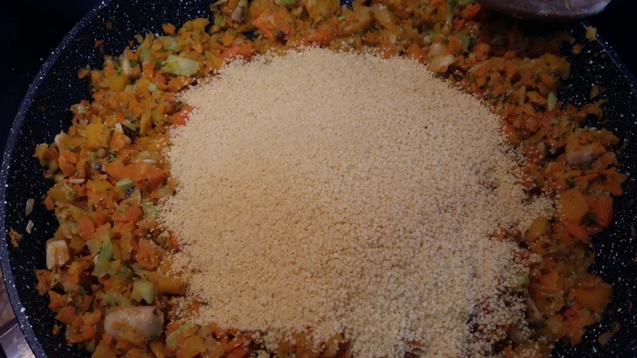 Añadimos el cuscús a la sarten con las verduras y mezclamos bien para que la sémola se dore un poco.