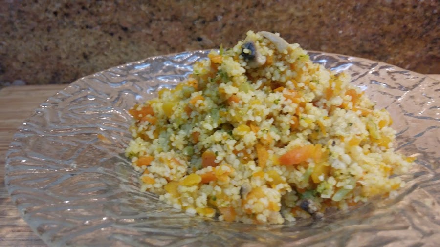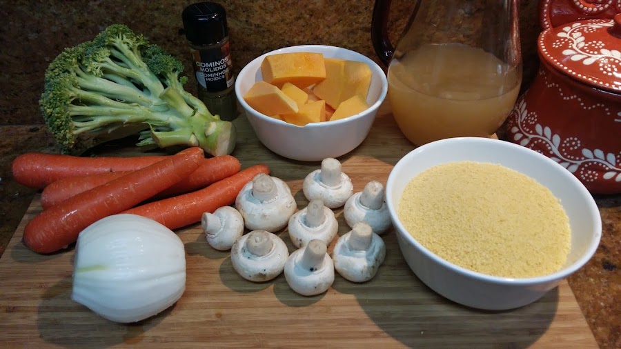 1/2 brócoli, 4 zanahorias medianas, 2 cebollas rojas pequeñas, 250 gr de calabaza, 8 champiñones medianos, 2 vasos de cuscús, 2 vasos y medio de caldo vegetal, comino en polvo y 10 pasas de corinto.Sal.