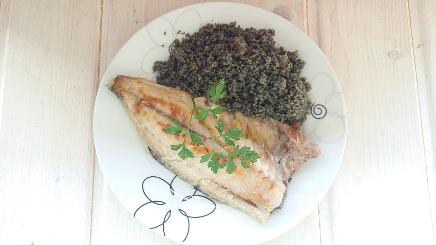 Yo he escogido el jurel porque suele ser muy económico, y no se desperdicia mucho en estos de ración. Pero, por supuesto, este cuscús negro combina genial con cualquier otro pescado que os guste; casi todos admiten la preparación a la plancha: lubina, corvina, bacalao fresco, merluza...