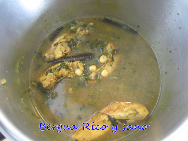 7. Como los garbanzos requieren más tiempo de cocción y ya tenía garbanzos cocidos en casa, los añadí al caldo y el pollo después. Si no, sería necesario dejarlos en remojo la noche antes y precocerlos un poco.
