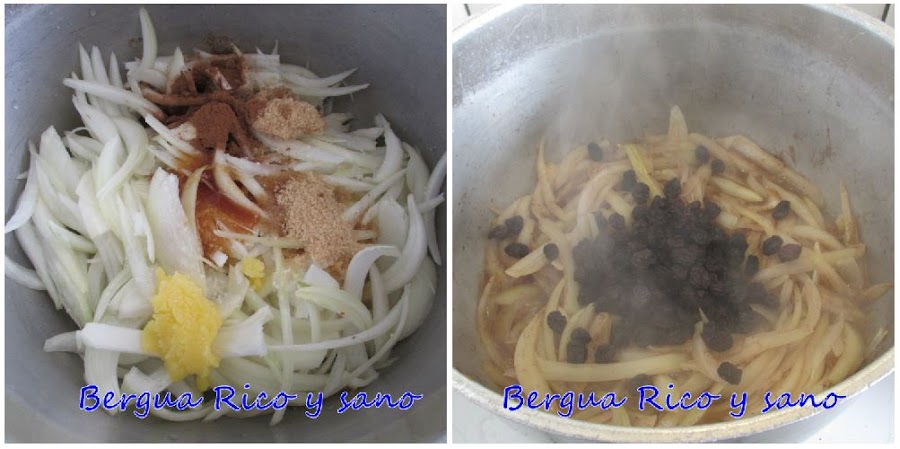 3. Pasados 10 minutos, cuando la cebolla esté blanda, añadimos las pasas. A partir de ahí dejamos que cueza tranquilo y tapado. De vez en cuando removemos. Yo le daría unos 40 minutos; si en algún momento hace falta, añadimos otro culito de vaso de agua para que no se cristalice y se pegue el azúcar. En total le doy 60 minutos, y los últimos 10-20 minutos retiro la tapa.