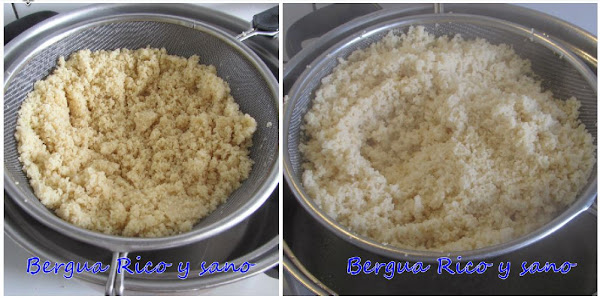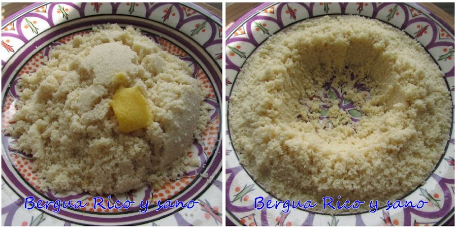 4. El cuscús también tarda un poco, así que vamos a por ello. Antes de nada, lo hidratamos con un chorrito de agua y un par de cucharadas de aceite (normalmente con las manos, pero también vale un tenedor). Entonces lo pasamos a un colador de rejilla de metal con agujero muy estrecho (para que no se cuelen los granos). No hay que apretar, para que no quede compacto. De hecho, debemos pasar un cuchillo a través para abrir pasos para el vapor.