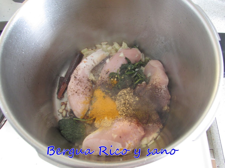 6. El pollo va a ser lo más rápido porque lo vamos a hacer en olla rápida; si no, tardaría unos 40 minutos, como el cuscús. Primero calentamos aceite de girasol en la olla, entonces rehogamos el pollo en trozos con la cebolla picada o en juliana, el perejil y el cilantro, sal, jengibre, pimienta, cúrcuma y canela en rama. Pasados unos 5 minutos, añadimos casi un litro de agua y la pastilla de caldo de verdura. En realidad, 1 litro es mucho, pero el caldo está buenísimo, sirve para regar el cuscús luego y siempre se puede aprovechar. Le damos el tiempo que requiera nuestra olla para el pollo; en mi caso, 9 minutos.