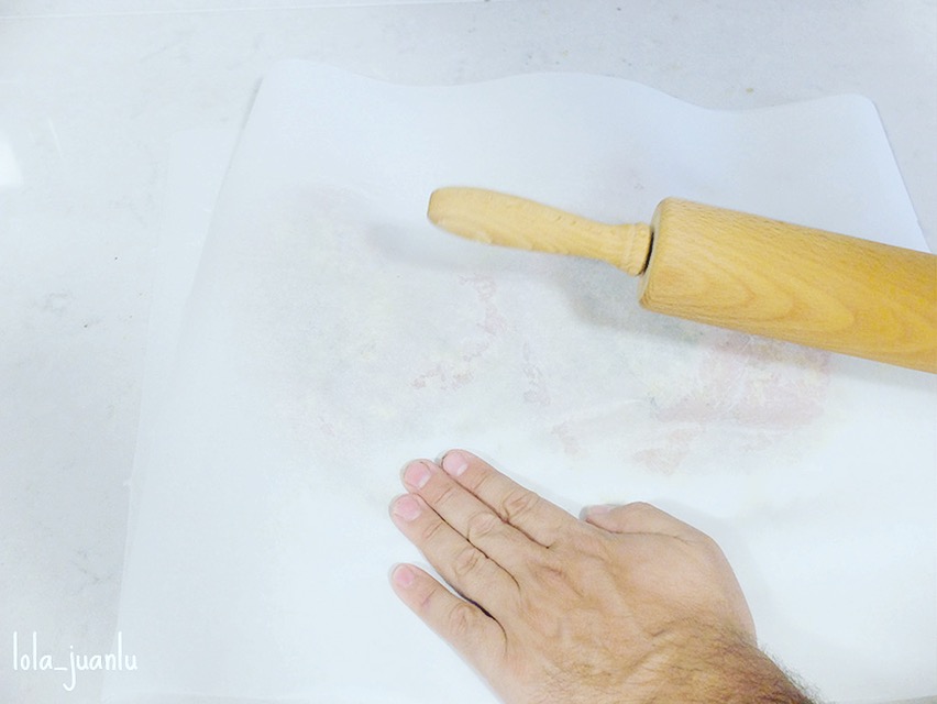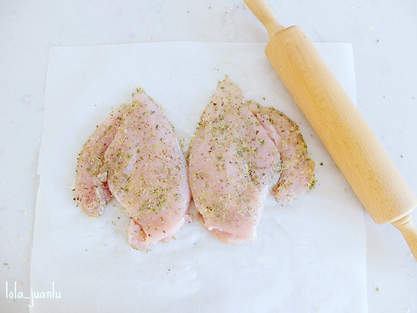 Colocamos sobre las pechugas la otra hoja de papel de hornear y con ayuda del rodillo aplastamos hasta que tenga todo el mismo grosor, pero que no sea demasiado fino. Esto también hace que el aderezo se incruste en la carne.