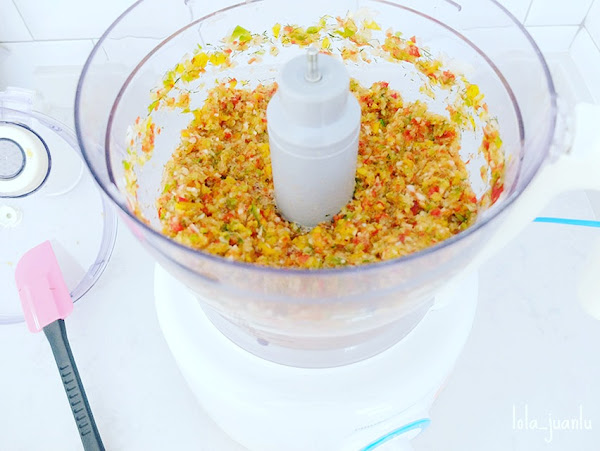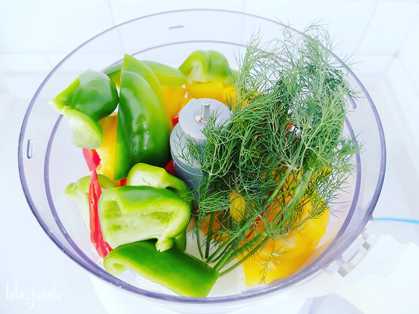 Ahora nos ponemos con las verduras. Lo primero es lavarlas y secarlas bien. Cogemos las cebolletas, le cortamos los extremos, las partimos en cuartos y los echamos en el vaso de un procesador de alimentos o robot de cocina. A continuación, quitamos los tallos y las semillas a los pimientos y a la guindilla, los cortamos en trozos grandes y lo añadimos al vaso. Agregamos el eneldo y batimos hasta que quede bien picado.