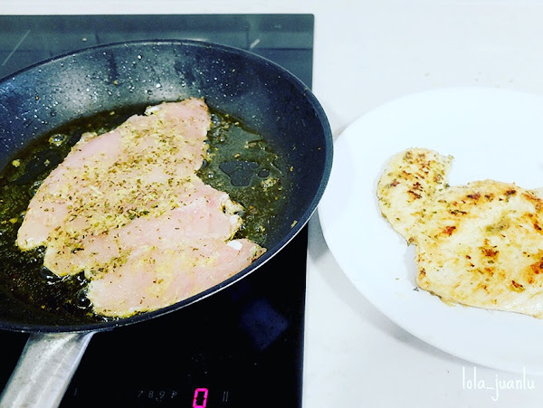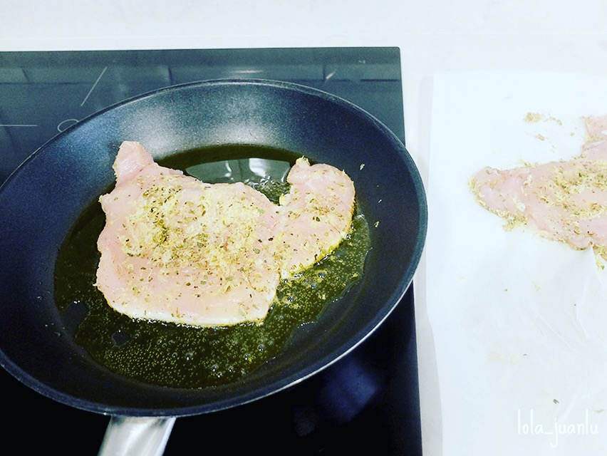Ponemos una sartén a fuego medio con una cucharada de aove y cuando el aceite esté calienta freímos el pollo, dándole la vuelta de vez en cuando, hasta que esté dorado.
