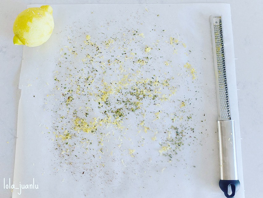 Vamos a empezar con las pechugas y para ello vamos a necesitar dos hojas de papel de hornear, un rodillo y un rallador. Colocamos una hoja de papel de hornear sobre la superficie de trabajo. A continuación cogemos el limón y rallamos la mitad de la piel de éste, directamente sobre la hoja de papel de hornear. Espolvoreamos 1/2 cucharadita de orégano, un poco de sal y de pimienta.