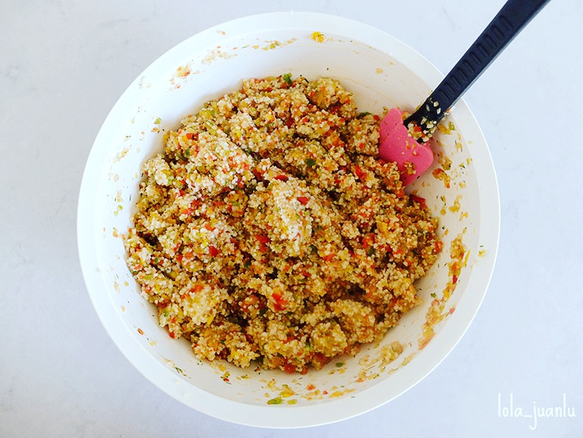 Destapamos el bol y vemos que el cuscús ha absorbido todo el agua. Añadimos las verduras picadas y mezclamos.