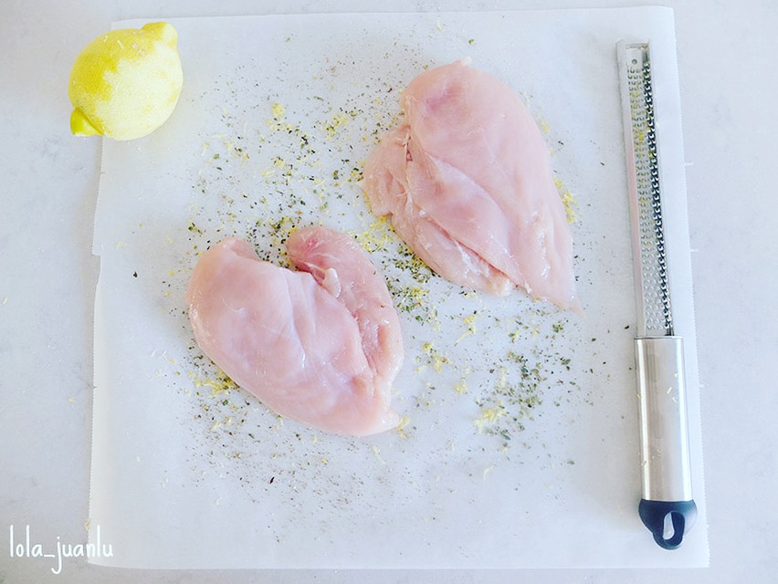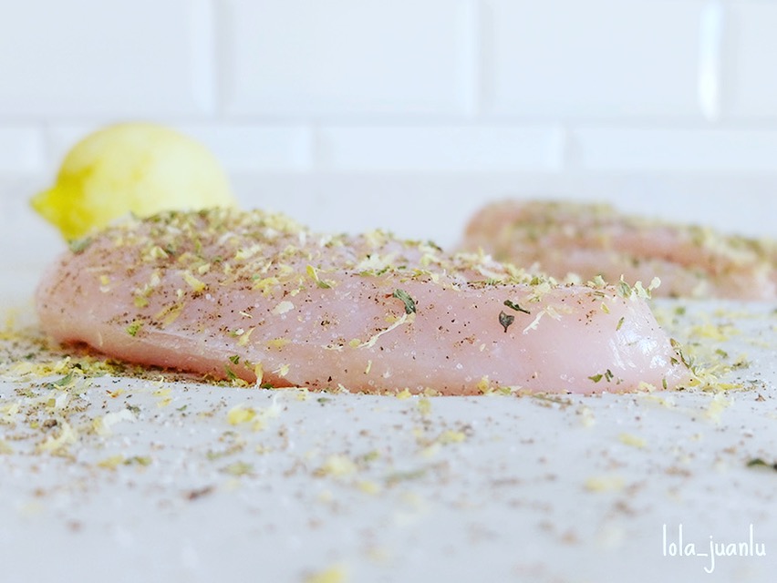 Colocamos las pechugas de pollo sobre las que rallamos el resto de la piel del limón, espolvoreamos 1/2 cucharadita de orégano y salpimentamos.