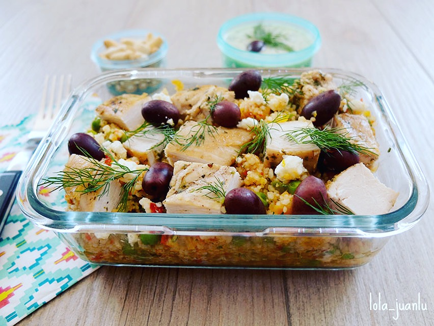 Como veis, las tiras de pollo las he cortado en cubos, para que sólo necesitemos un tenedor para poder disfrutar de esta deliciosa ensalada de cuscús vegetal con pollo griego.