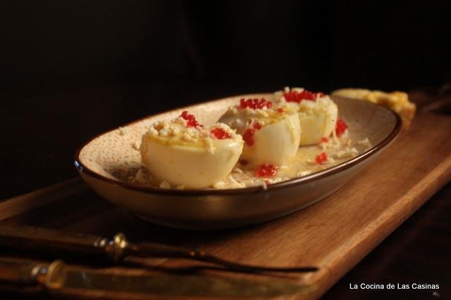 En el blog Cocina a Buenas Horas encontraremos una receta diferente de huevos rellenos. Y digo diferente porque estos se sirven calentitos. Fáciles de hacer como este tipo de receta: solo debes vaciar los huevos cocidos con cuidado de no romper las claras, rellenar con tomate frito u otras salsas con ingredientes adicionales mezclada previamente con atún. Rellenamos y le colocamos la bechamel, rallamos las yemas de huevo y servimos. Puedes ver al detalle la elaboración de esta receta haciendo clic a continuación: