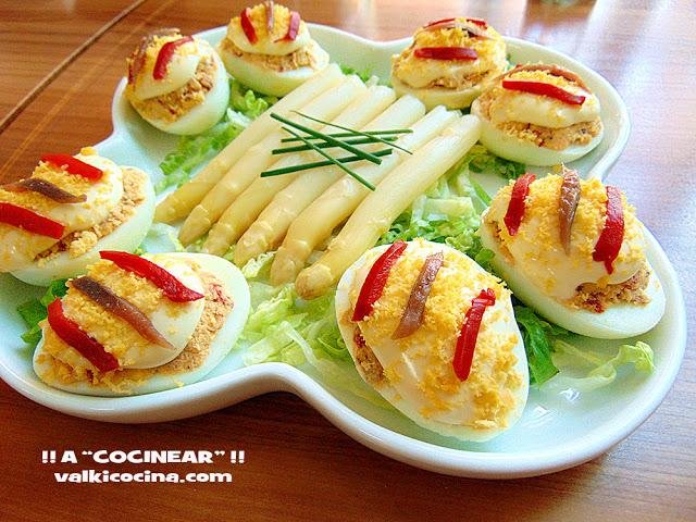 En el blog Valkicocina encontramos esta sencilla y deliciosa receta, para elaborarla lo primero que haremos es cocinar los huevos y retirar las yemas con cuidado. En un bol añadimos las yemas, junto con el atún, pimientos troceados y anchoas. Rellenamos las yemas y finalizamos con un poco de mayonesa, tiritas de pimiento, anchoas y yemas ralladas. Para ver al detalle la proporción de ingredientes y elaboración puedes hacer clic a continuación: