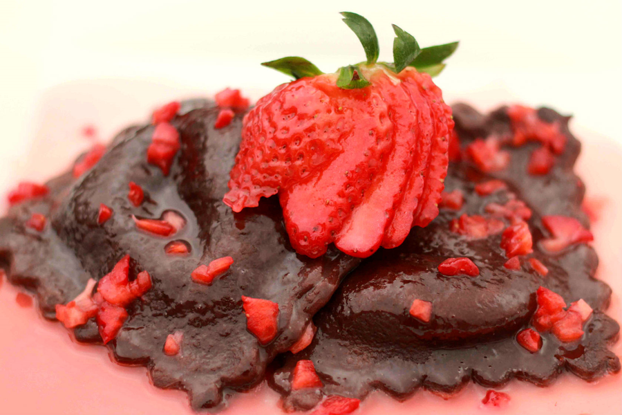 Cerramos con un postre elaborado con pasta casera de chocolate de mi blog Cocina con Clau. Preparamos previamente la masa con cacao en polvo, harina, huevo, azúcar, sal y aceite. Dejamos reposar. Mientras hacemos la salsa; en una olla ponemos mantequilla que dejaremos fundir. Incorporamos fresas picadas y posteriormente albahaca. Dejamos cocinar. Y Retiramos del fuego. Posteriormente colamos y utilizaremos las fresas y la albahaca para el relleno. Después del reposo estiramos y le damos forma de raviolis. Rellenamos con pasta de chocolate para untar y fresas troceadas. Sellamos la pasta y cocinamos en agua hirviendo. Retiramos y servimos junto con la salsa colada y si te gusta una bola de helado. Puedes ver al detalle la preparación, proporciones y resto de ingredientes aquí: