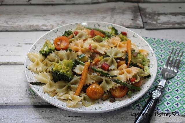 El blog Tapitas y Postres nos trae una deliciosa pasta con verduritas, lo primero que haremos es cocinar la pasta en agua, reservamos. Por otro lado cocinamos al microondas brócoli, reservamos y en una sartén con aceite cocinamos cebolla, luego añadimos pimientos, zanahoria, el brócoli y resto de verduras, sazonamos. Incorporamos la pasta elaborada previamente y escurrida. Servimos caliente. Puedes ver al detalle la elaboración y resto de ingredientes a continuación: