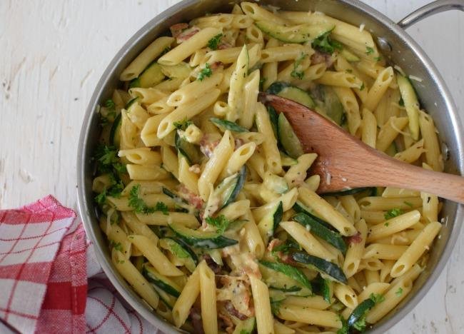 En el blog Bizcochos y Sancochos encontraremos una receta que tampoco puede faltar en este recopilatorio la famosa salsa a la carbonara. Primero cocinamos la pasta según las instrucciones del fabricante. Mientras tanto vamos haciendo la salsa: En un sarten cocinamos tocineta, calabacín cortado previamente en juliana. Añadimos hierbas y especias. Dejamos cocinar y preparamos una mezcla con yemas de huevo, crema de leche (nata liquida) y un queso mezclamos y añadimos sal y pimienta. Reservamos. Cuando el calabacín este cocido añadimos la pasta previamente escurrida. Removemos e incorporamos la mezcla de huevos y crema de leche. Removemos y añadimos queso. Servimos caliente. Para ver la preparación de esta receta de forma más detallada así como resto de ingredientes y proporciones, clic a continuación: