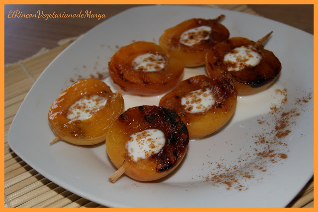 4.- Otra idea es hacer el albaricoque en brochetas y caramelizarlas. El rincón vegetariano de Marga nos presenta las brochetas de albaricoque con yogurt y canela. ¡Tienen que estar muy ricas porque ella las toma para el desayuno!