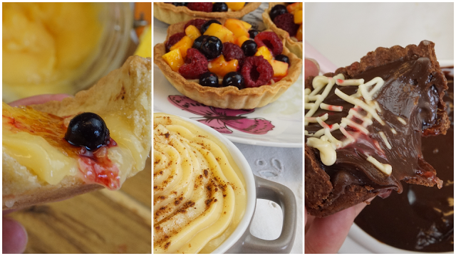 Y una vez hechas nuestras cremas podemos rellenar y decorar nuestras tartas, yo hice unas tartaletas con quebrada, aquí os dejo el vídeo de como hacer masa quebrada que va genial con estas cremas al microondas: