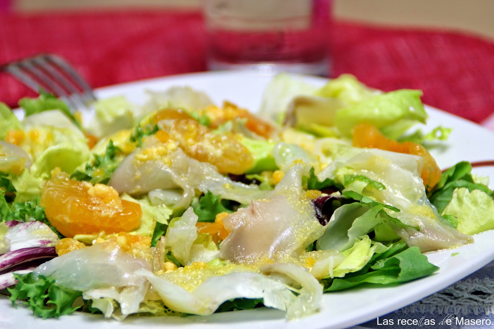1. De mi blog, Las recetas de Masero, tenemos una ensalada de bacalao ahumado y mandarina, (pincha en el nombre para ver la receta completa) una combinación genial entre un buen ahumado y el sabor cítrico de la mandarina: