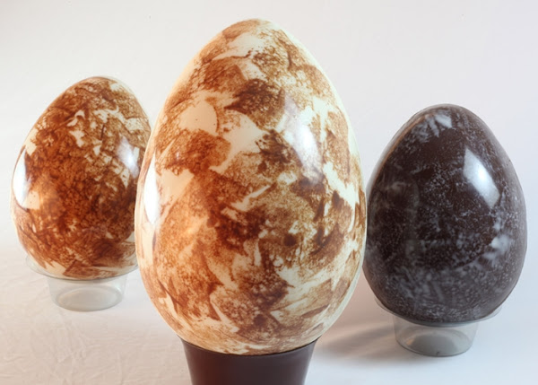 Para hacer huevos de Pascua marmolados, funde el chocolate blanco o negro al microondas o a baño María y con ayuda de una esponja o un pincel, ve haciendo pequeños golpecitos en los moldes.