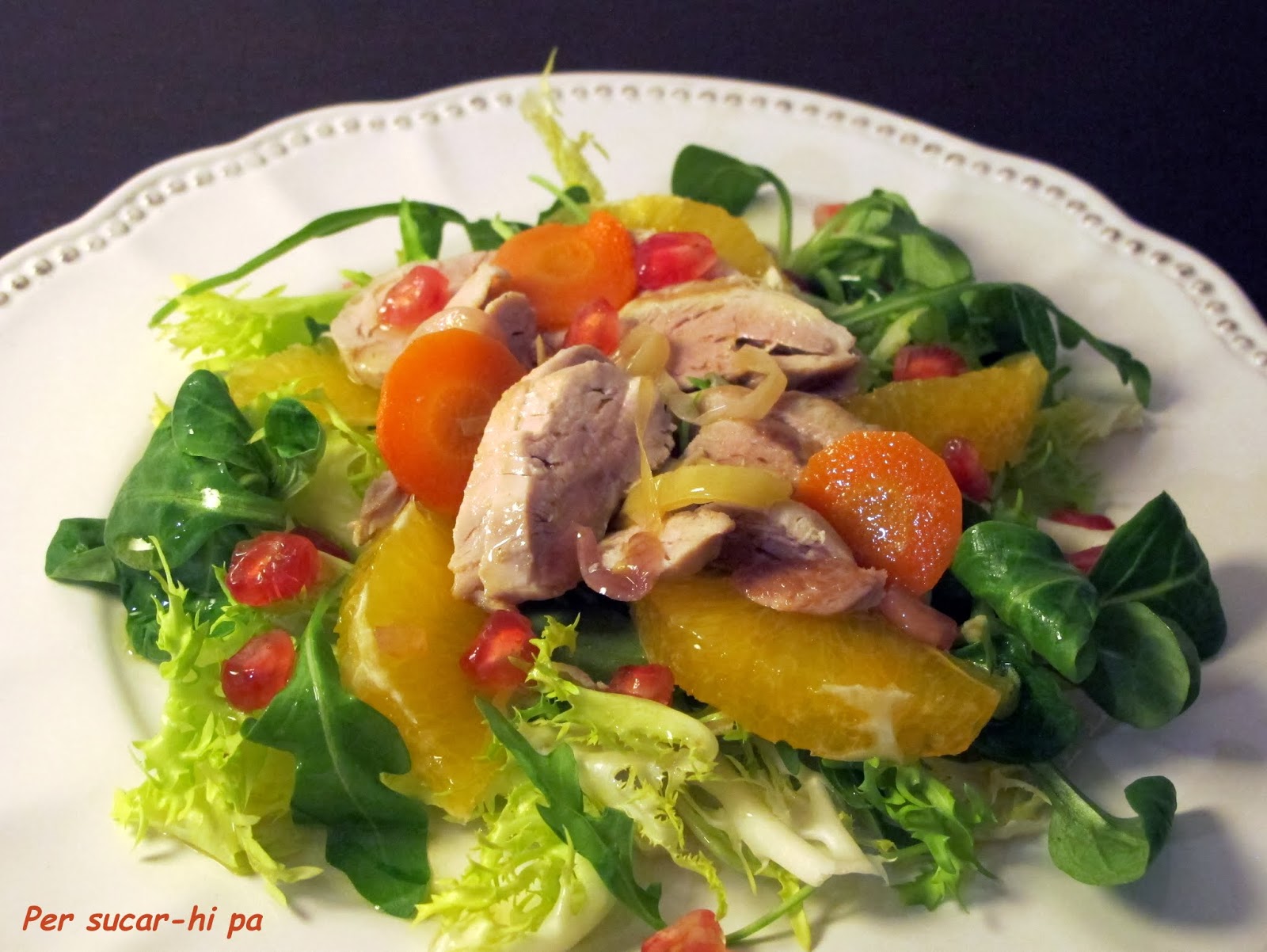 Que tal enseñaros como queda una Ensalada con codorniz en escabeche, pues es ideal, hace de una simple ensalada un lujo de plato, nos lo propone el blog Per sucar hi-pa, que además de cocinarlas, nos propone la ensalada con granada , naranjas y rúcula, un plato para invitados muy especiales, donde añadimos la zanahoria del escabeche.