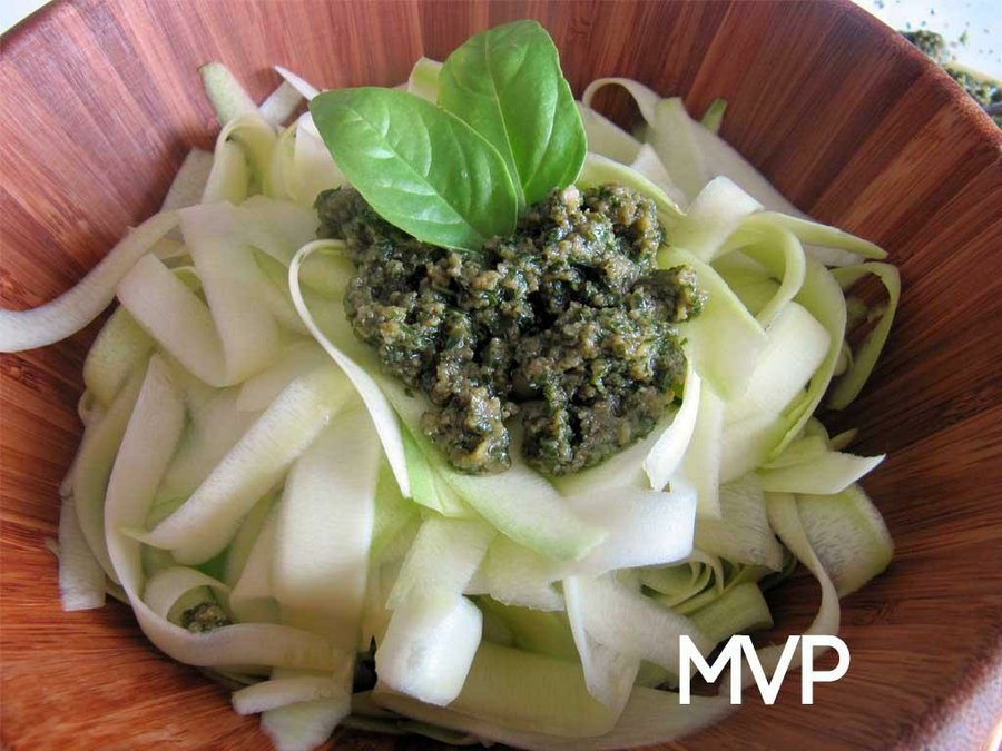 En este caso la pasta no proviene de un cereal sino que se hace a partir de calabacín crudo. La textura es sorprendentemente similar a la pasta cocida pero mucho más bajo en calorías! Sólo se necesita un calabacín crudo y un pelador de patatas para preparar las tallarines. La receta también incluye cómo preparar una salsa de pesto casera y vegana. Se necesita albahaca, frutos secos, aceite y ajo (opcionalmente sal y levadura nutricional), se tritura todo y ya está listo para disfrutar! Una receta ideal si quieres comer ligero y saludable. La receta es de MyVegiePlace y la puedes ver aquí (incluye video de la preparación).