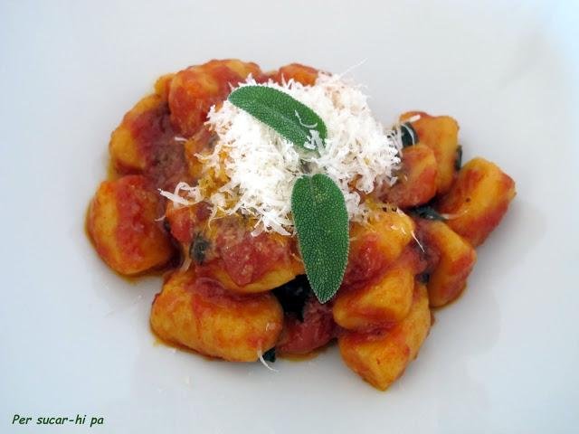 Me encantan los gnocchis! Originalmente son de patata y harina pero existen muchas variaciones. Con esta receta podemos hacerlos de calabaza y así darles un color distinto! Para que la masa sea vegana se puede sustituir el huevo por 1 cucharada de semillas de lino molidas disuelta con 2,5 cucharadas de agua. Una vez esté lista tenemos que formar unos "churros", enharinarlos y cortarlos a trocitos. Luego se cuecen en agua hirviendo y sabremos que están listos cuando floten. La salsa para acompañarlo tampoco deja indiferente! Entre sus ingredientes aparece la Salvia, la cual le dará un sabor especial. La receta es de Per sucar-hi pa y la tienes aquí.