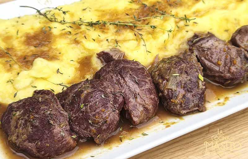 Carrilleras de cerdo en salsa. Esta receta queda de lujo; a todo el que la prueba, le encanta. Podéis cocinar las carrilleras el día anterior y solo necesitaréis hacer el puré cuando las vayáis a consumir.