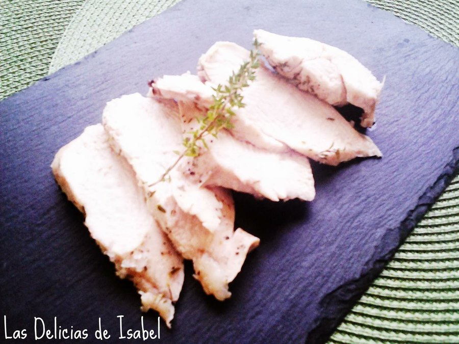 En una fuente de horno, ponemos una buena capa de sal, ponemos encima las pechugas que previamente hemos aliñado con pimienta y tomillo,por ambos lados, cubrimos con mas sal, y hacemos al horno a 200º durante 30 minutos, sacamos la bandeja, rompemos la capa de sal y sacamos las pechugas y fileteamos, salen jugosas y con todo su sabor, y puedes acompañarla con la salsa que mas te guste.