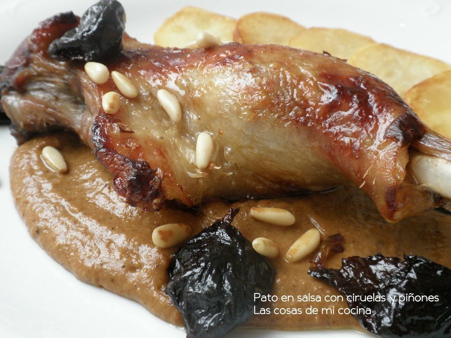 Os gusta el pato? a mi me encanta, y este Pato en salsa con ciruelas y piñones me ha cautivado, para hacerla necesitamos, 1 muslo de pato por persona, zanahoria, puerros, brandy, vino blanco, cebollas, piñones y ciruelas, además de aceite de oliva.