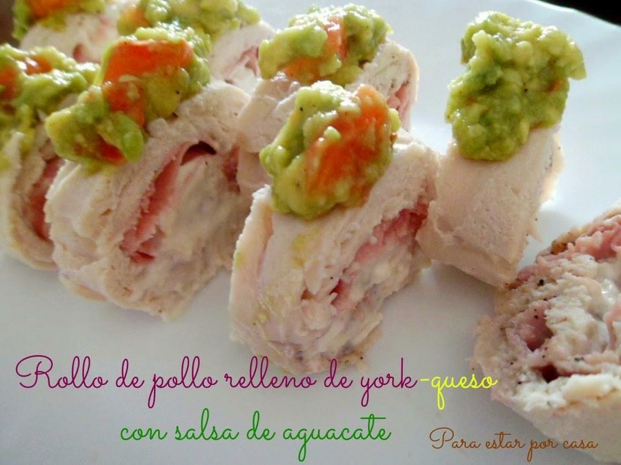 Desde el blog Para estar por casa, Rollos de pollo rellenos con salsa de aguacate, esta receta es muy atractiva, es ligera y se hace en el microondas, necesitamos unos filetes de pollo,jamón de york, queso crema, sal y pimienta,la salsa es ni mas ni menos que guacamole, que haremos mezclando aguacate con tomate, cóminos,aceite y guindilla.