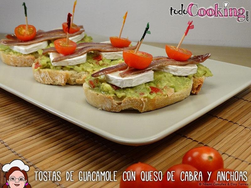 Desde el blog Todo cukking me ham encantado estas Tostas de guacamole con queso de cabra y anchoas, una combinación estupenda de ingredientes, para prepararlas necesitamos, pan de pueblo, rulo de queso de cabra, anchoas y salsa de guacamole, para el guacamole necesitamos aguacates, tomates, cebolla, chile, cilantro, limón,sal y pimienta, mezclamos todo, ponemos el guacamole encima del pan, el queso de cabra y la anchoa.