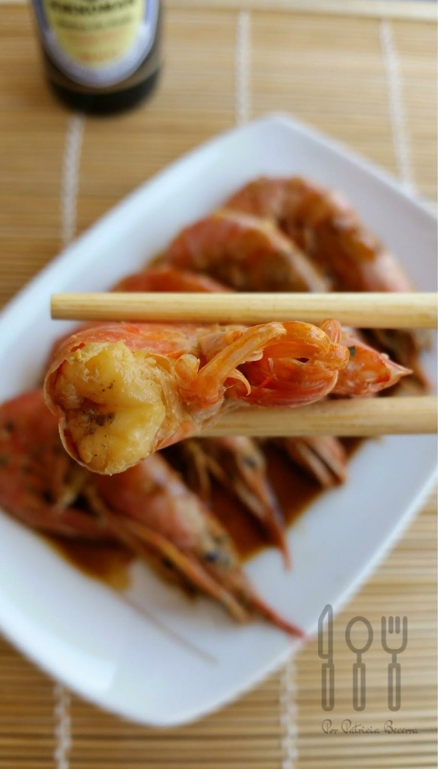 Otra receta que me gusta mucho son las Gambas con salsa de soja picantes, además de el ingrediente principal que son las gambas, necesitamos,salsa de soja, vinagre de manzana, semillas de sésamo,ajo y jengibre, mezclamos los ingredientes de la salsa y abrimos un poco las gambas para que penetre bien la salsa, hacemos las gambas en la sartén y añadimos la salsa, movemos con movimientos circulales para que la salsa espese y listas para servir.La receta es del blog Las cosas de mi cocina.