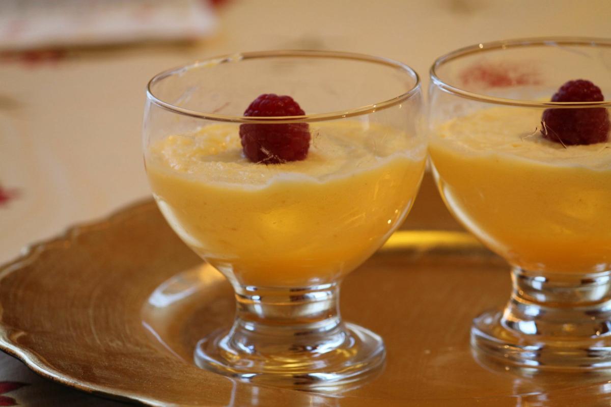 Vasitos de mousse de limón con salsa de chocolate blanco y frambuesas confitadas:
