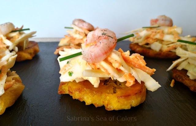 Vamos a comenzar con mi última creación, en mi web Sabrina's Sea of Colors encontrarás estos Tostones con coleslaw. Una excelente combinación para la que necesitas plátano macho verde, repollo, zanahoria y camarones, entre otros ingredientes. Preparamos los tostones con el plátano verde, luego haremos la ensalada coleslaw y los camarones. Ya sólo nos queda unir todo en un divertido montadito.