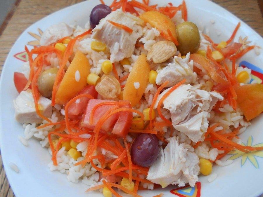 Ingredientes : arroz vaporizado, pollo en aceite, nísperos, zanahoria rallada, almendras, aceitunas, maiz dulce, tomate, sal, pimienta y aceite del pollo.