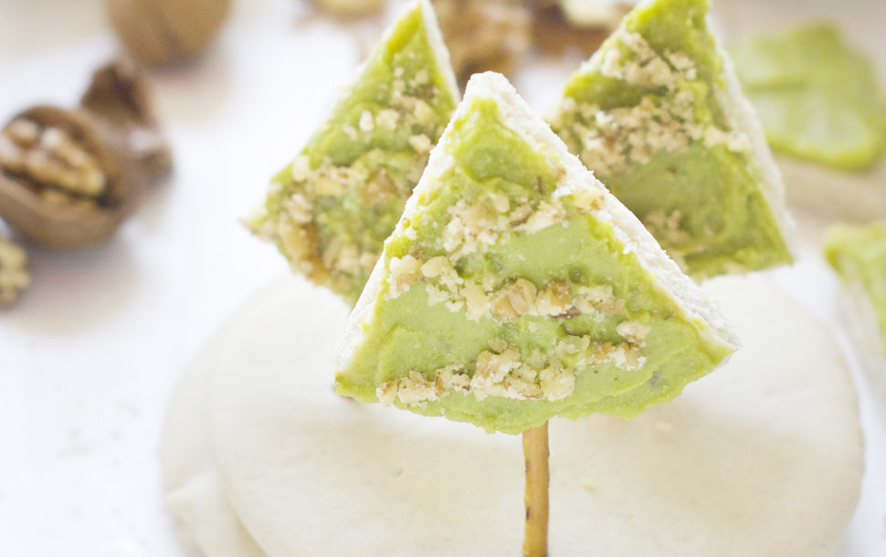 Tenemos que partir el pan de molde en triángulos, hacer el guacamole como nos dicen en la receta, con el aguacate, zumo de limón, tomate, cilantro y demás ingredientes, untamos el pan y lo pinchamos con un palito de madera, lo acompañamos de nueces...